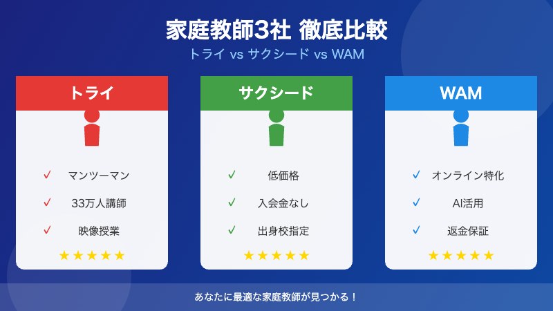 この記事では、人気の家庭教師3社「トライ」「サクシード」「WAM」を徹底比較します。